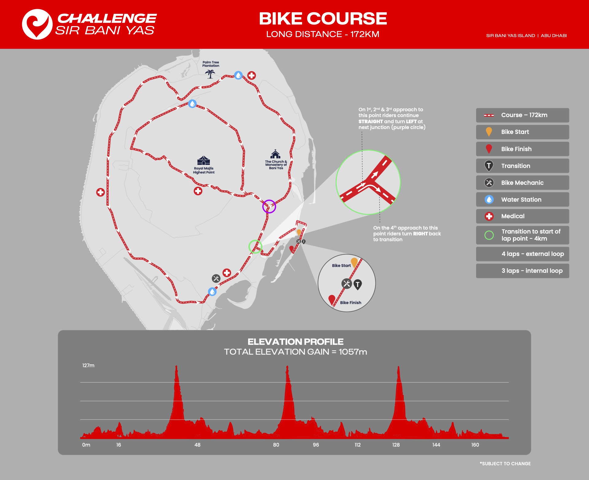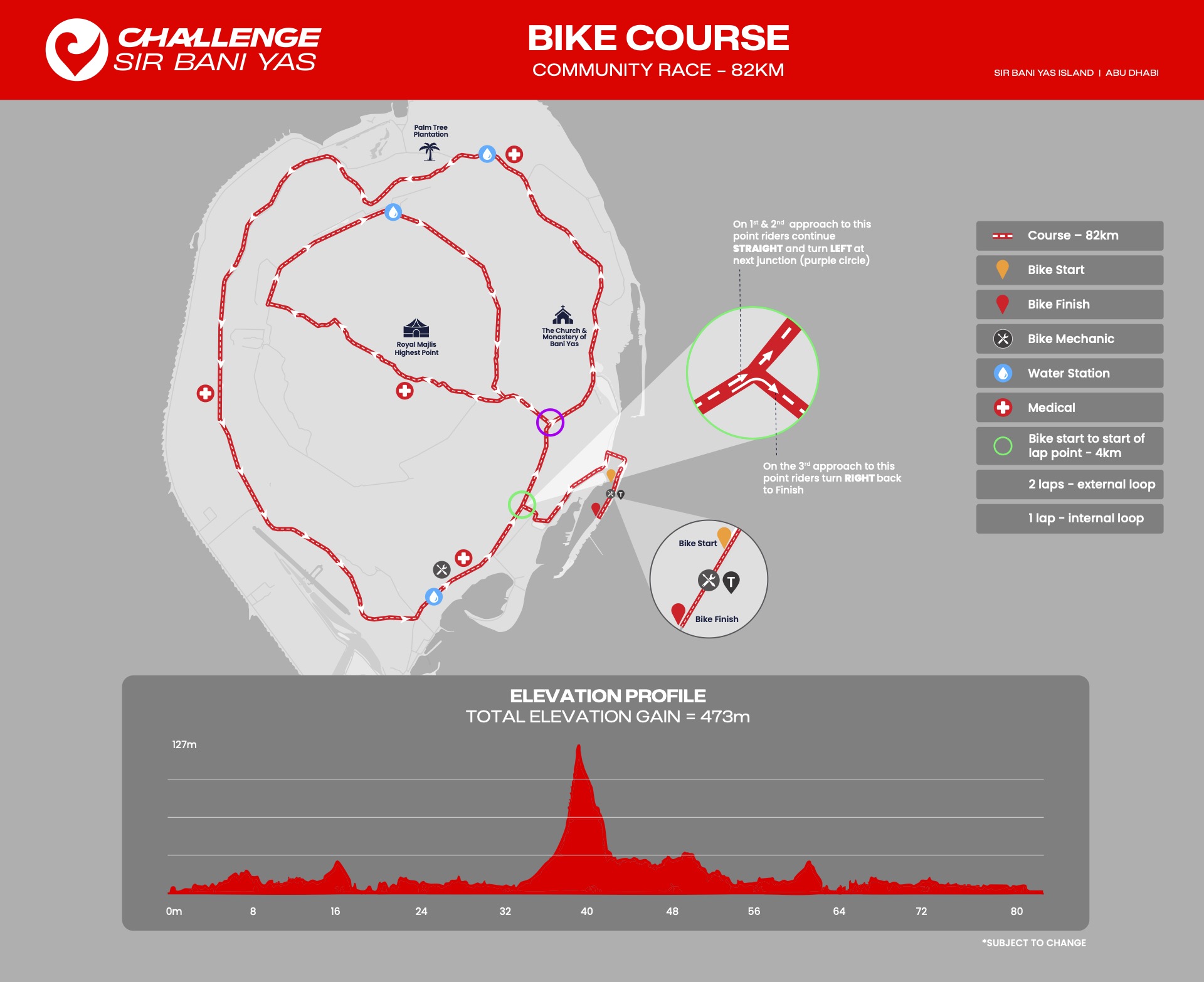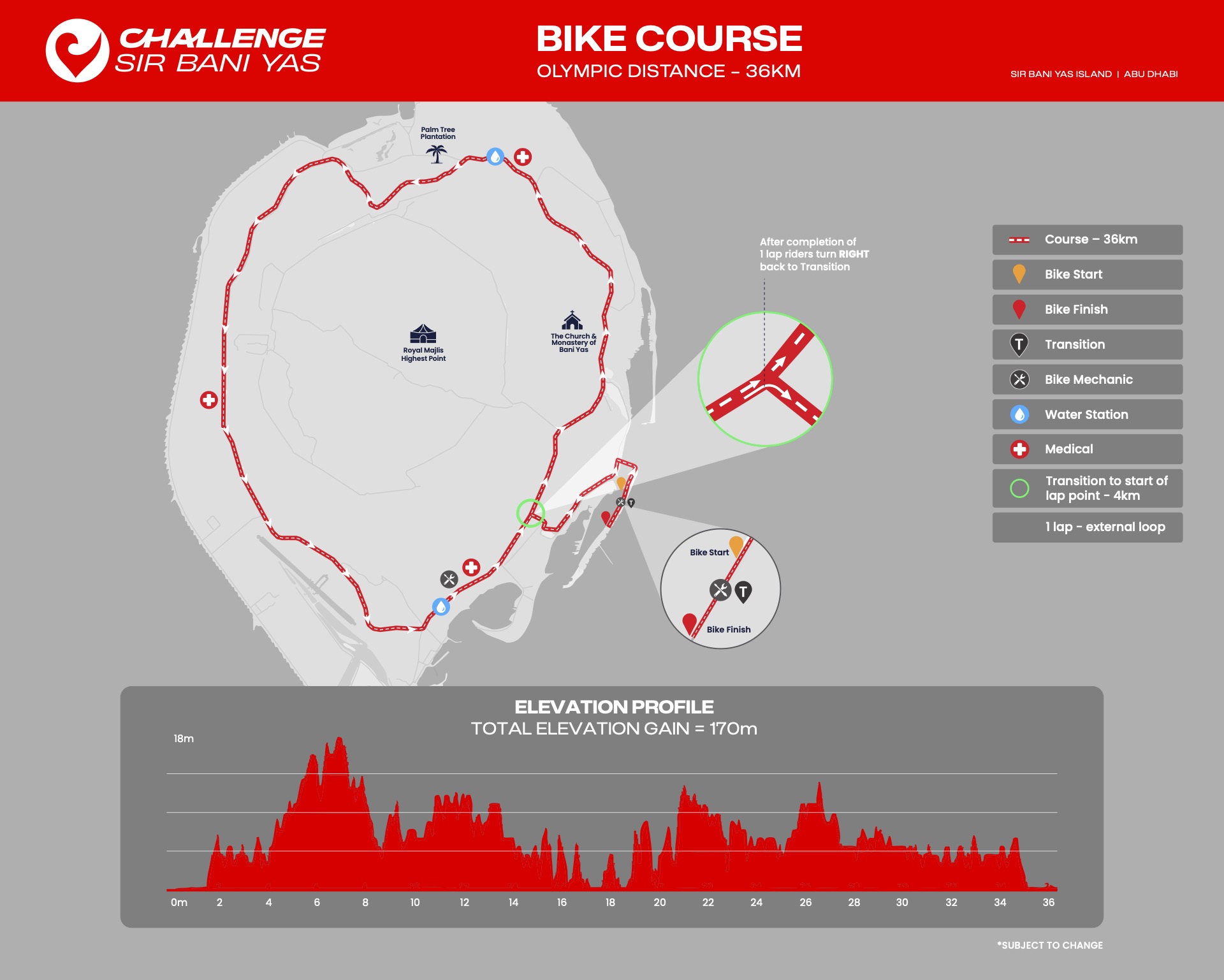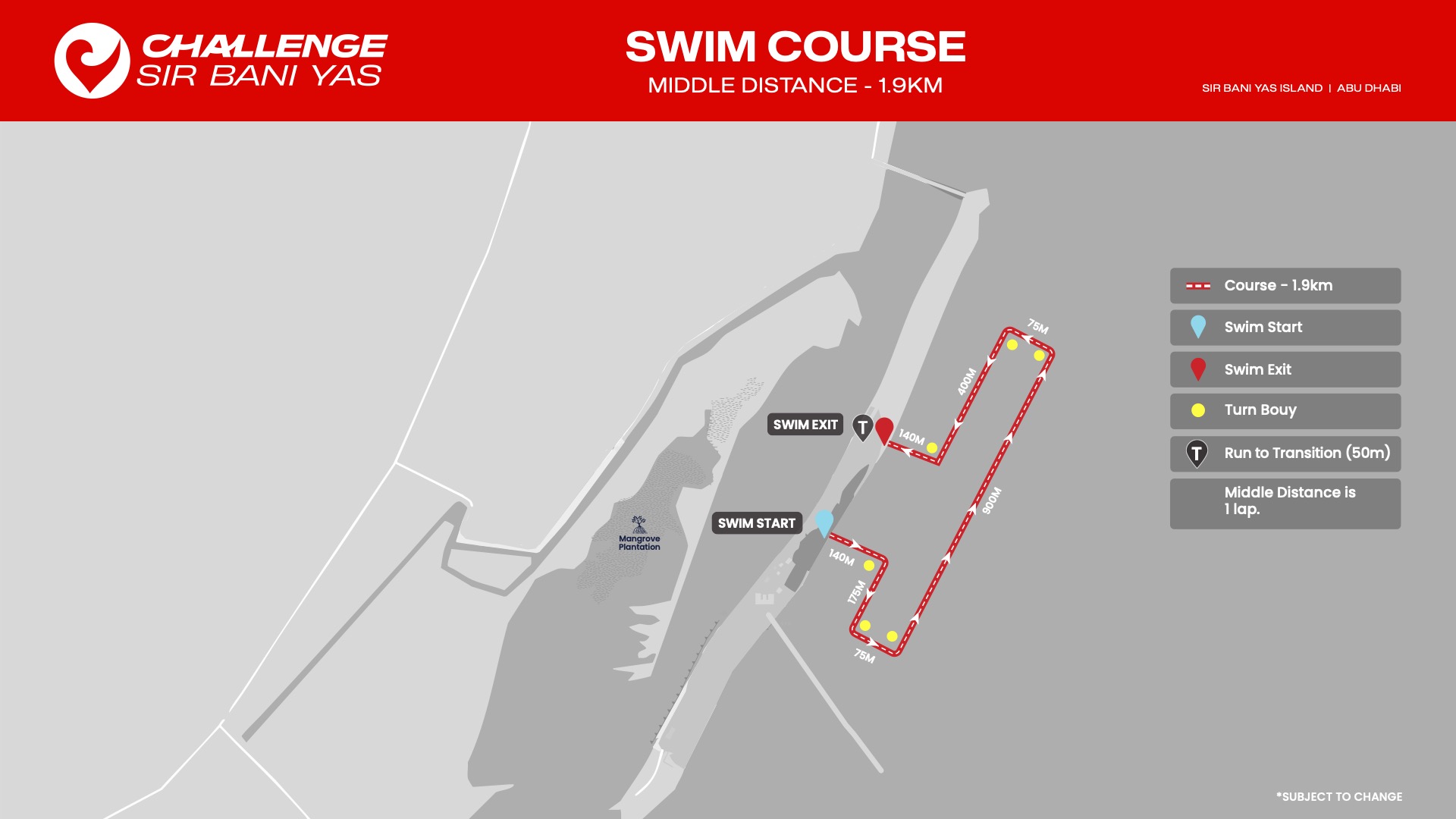 انطلق في مياه الخليج العربي الفيروزية الصافية، ضمن مسار سباحة دائري يقع في جنوب شرق الجزيرة، محمي من الأمواج ويتميّز بمياهه الهادئة، ليمنحك بداية مثالية للسباق.متوسط درجة حرارة الماء: 18 – 22 درجة.
